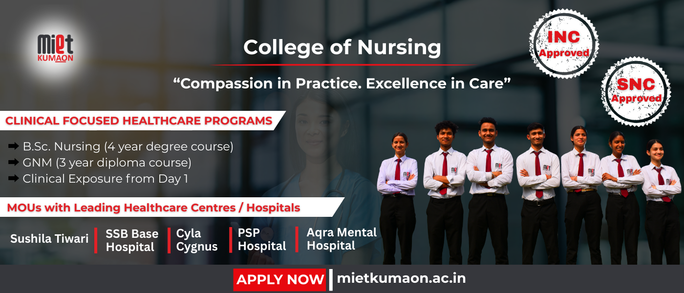 MIET Kumaon, situated in Haldwani, Uttarakhand, is a distinguished institution dedicated to delivering quality education across various disciplines. Established under the aegis of the Dev Bhoomi Foundation, MIET Kumaon is affiliated with esteemed universities such as Kumaun University, Nainital, and Hemwati Nandan Bahuguna Uttarakhand Medical Education University (HNBUMU), Dehradun. The college offers a range of undergraduate programs, including BCA, BBA, BPT, BMLT, BMRIT, GNM, and B.Sc Nursing, each designed to equip students with the necessary skills and knowledge for their respective fields.